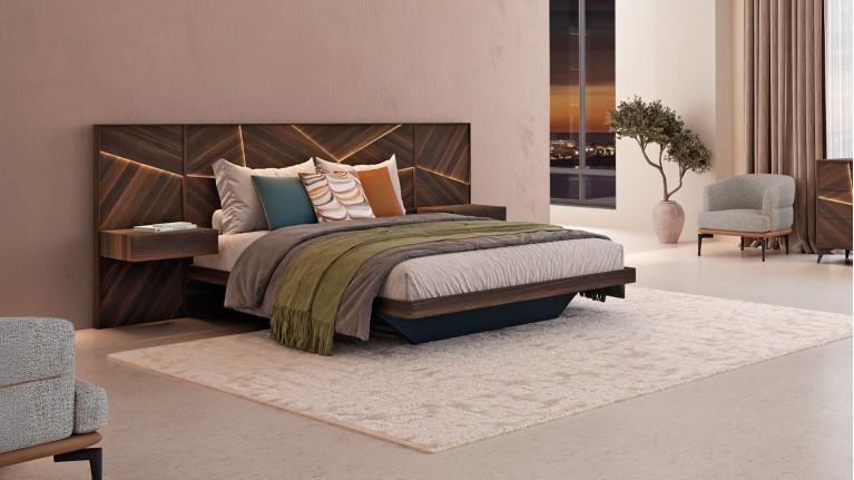 Optional intensity-adjustable LED lighting on bedside cabinets & headboard