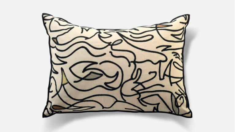Embroidered in Bourdon stitch on a natural linen and cotton canvas, the ANAMORPHOSE cushion is covered with undulating reliefs. The brightness of a few touches in shades of copper, gold or silver enhance this free design with virtually uninterrupted black lines. The back of this rectangular cushion is in unbleached linen edged in black.